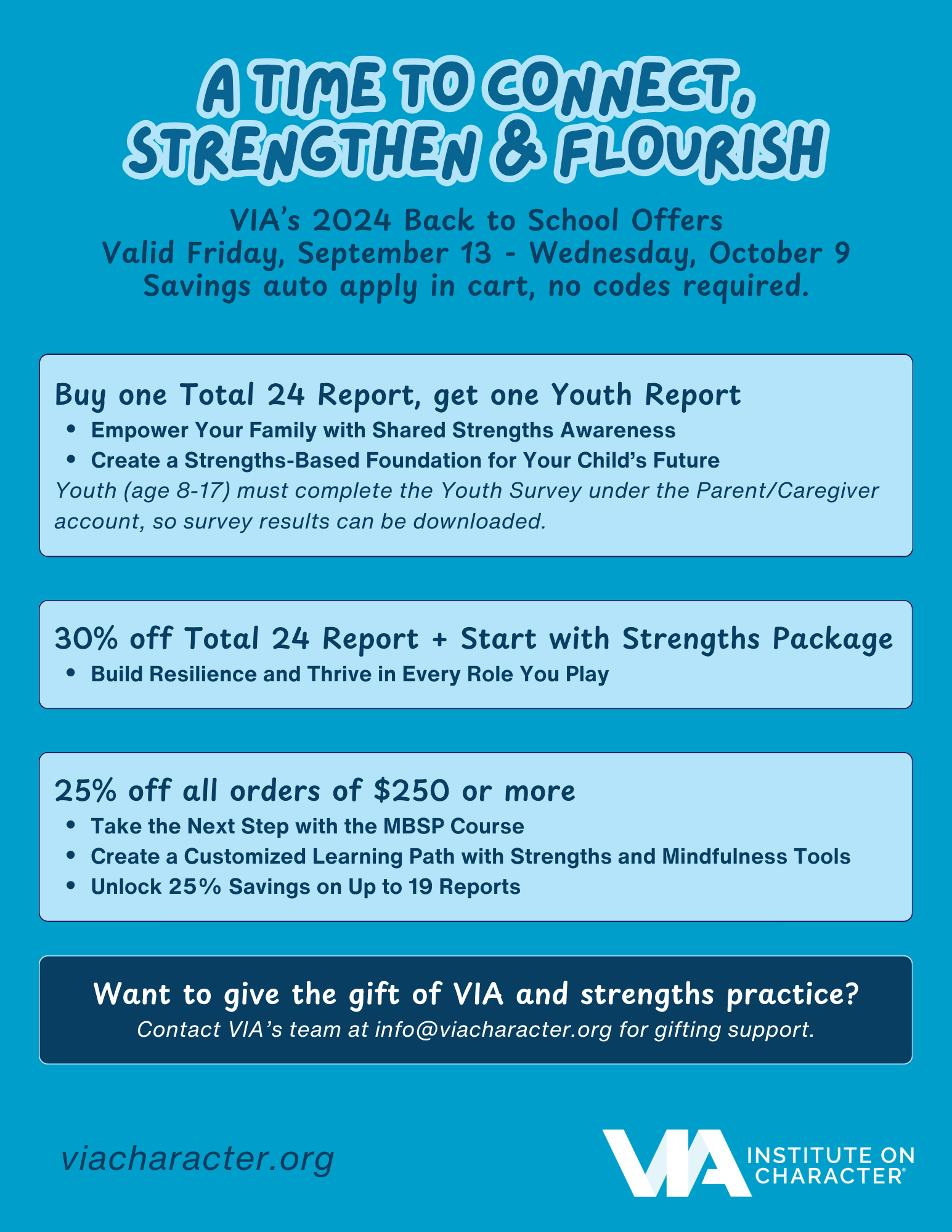 At VIA, we recognize that the back-to-school period can be both energizing and overwhelming. That’s where understanding our unique character strengths can make all the difference. When we lean into our strengths—whether it’s perseverance, kindness, or love of learning—we gain the resilience needed to handle stress with greater ease.
