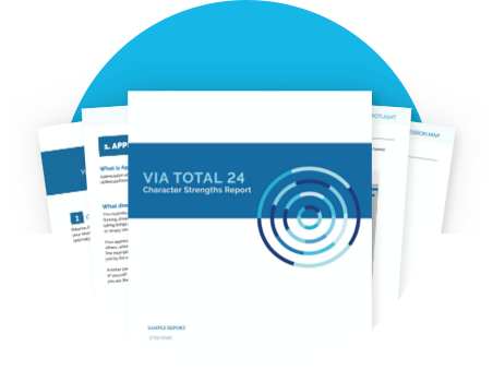 After you've completed the VIA Survey, your Total 24 Report provides the most thorough review of your 24 character strengths with the latest research-backed practices linking each of your strengths to different positive life outcomes such as greater happiness, higher achievement, better health and stronger relationships.