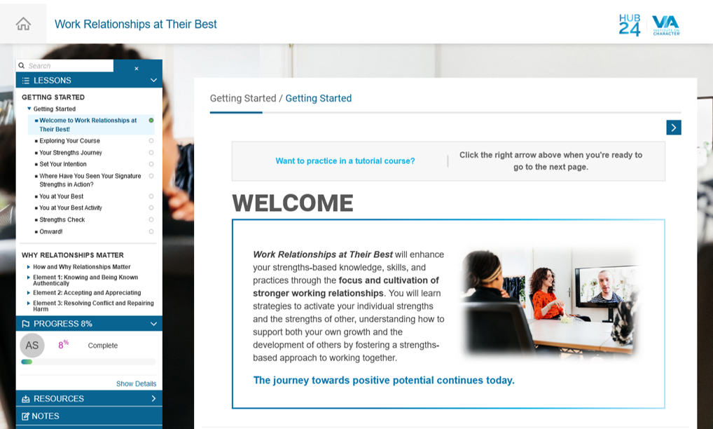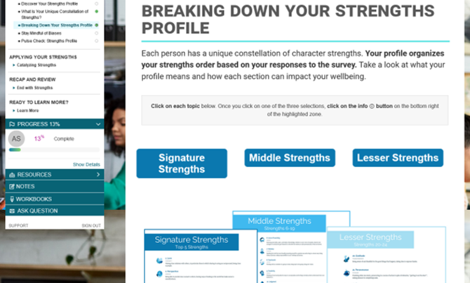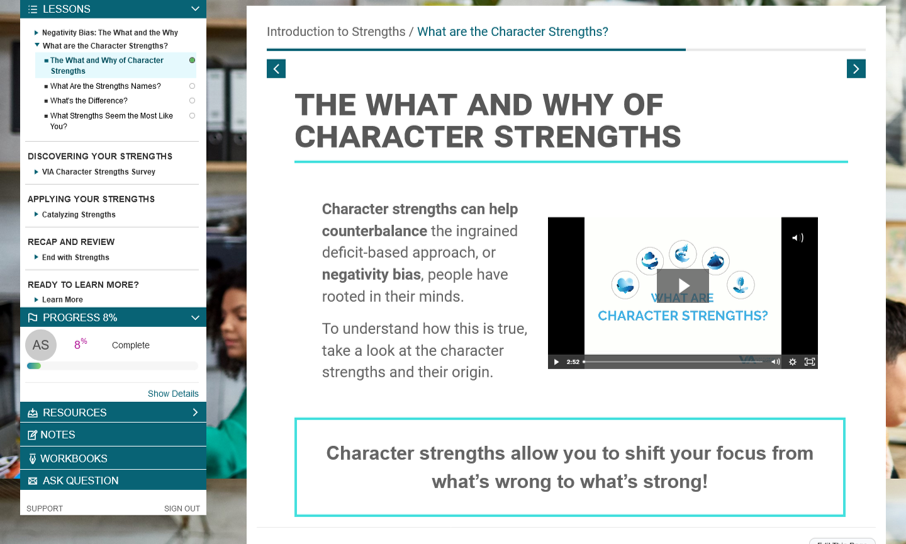 Research confirms that applying your character strengths can improve your well-being. When used together, this foundational course and personalized report teach you how to use your best qualities to: