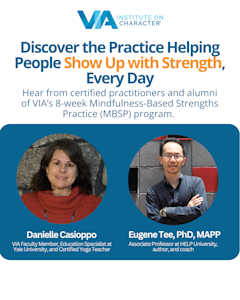 Join us for a conversation with Danielle Casioppo, VIA Faculty Member, Education Specialist at Yale University, and Certified Yoga Teacher, and Dr. Eugene Tee, Associate Professor at HELP University, a graduate of the University of Pennsylvania’s MAPP program, author, and coach. Both are experienced facilitators of VIA's Mindfulness-Based Strengths Practice (MBSP) — a life-changing 8-week program that helps people reduce stress, boost self-awareness, and live with greater meaning.