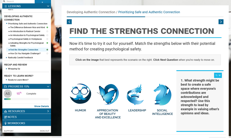 Dynamic Learning Path Includes fives courses that cover individual, relational, and collective strengths activation designed to meet the needs of all learners. Individuals have the flexibility to progress through the courses in the order that best suits their needs.